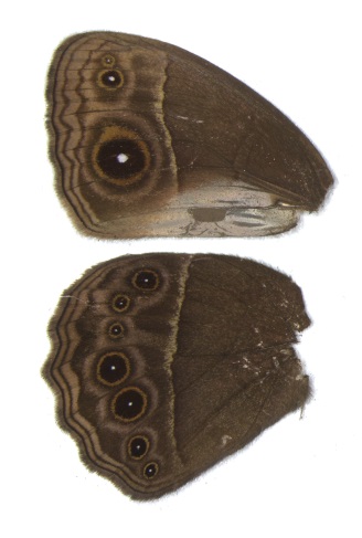 Bicyclus anynana wings - wet (above) and dry (below) season form, with noticable differences in eyespot size and number.