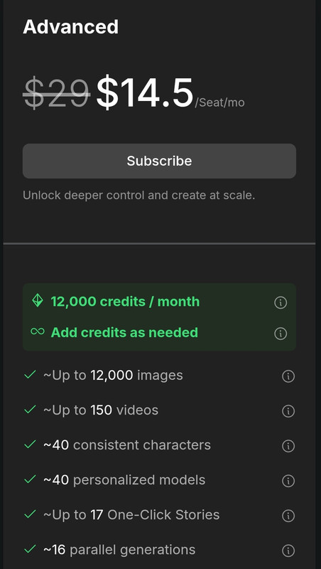$29 / month or $14.50 / month (annual billing) Designed for deeper creative control and larger volume.