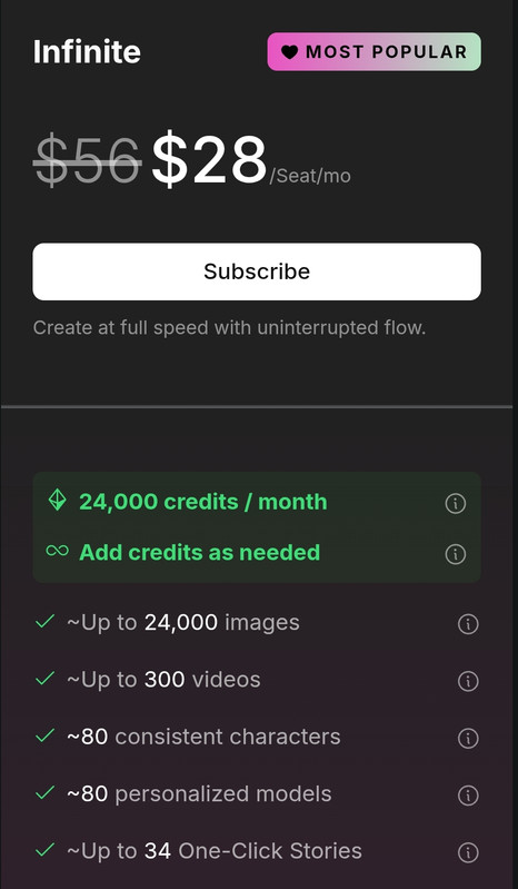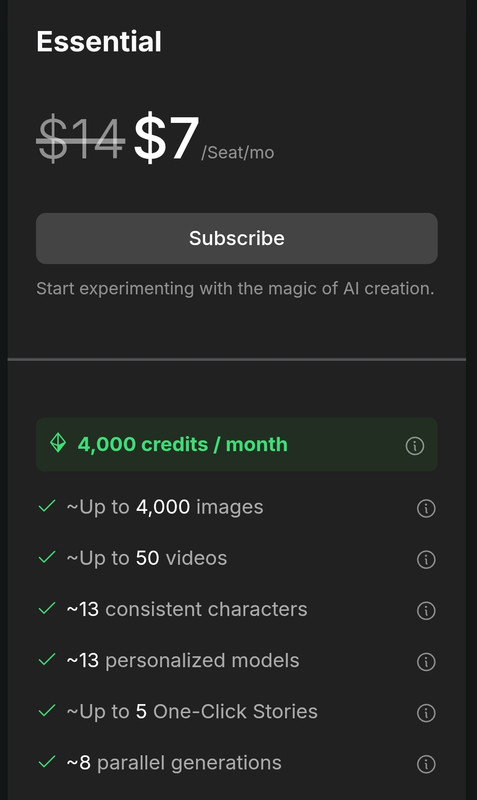 Each paid tier builds on the previous — more credits, more parallel generations, more characters & models, and more “One-Click Stories.” Higher tiers also unlock priority support and select unlimited usage for certain models.