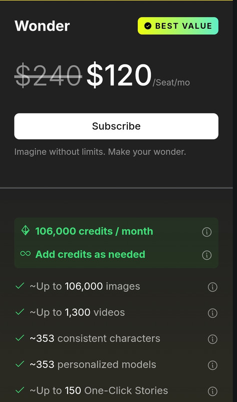 Unlimited Generation: Available on Infinite & Wonder plans for select models; subject to usage fairness policies.