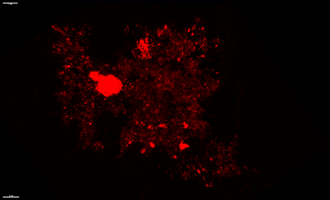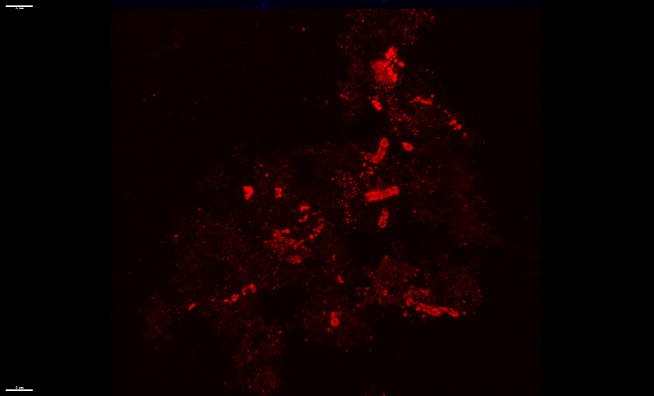 Confocal microscopy image of bacteria from whole saliva cultured in TY media at 37 deg C for 24 hours, with no in vivo or in vitro antimicrobial exposure. Calcophor (red, polysaccharides) only. Scale at lower left is 3 microns.