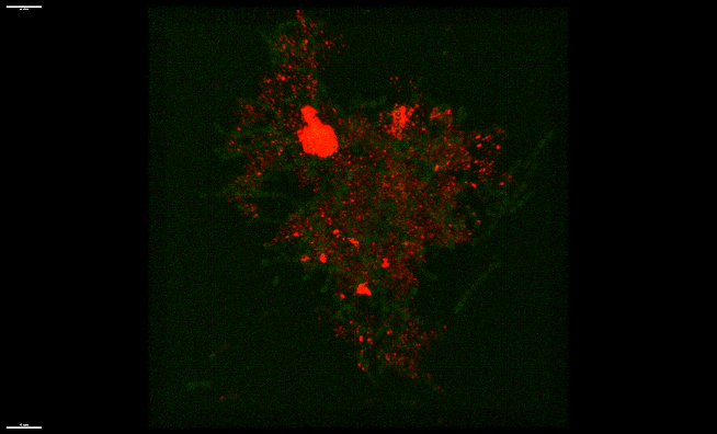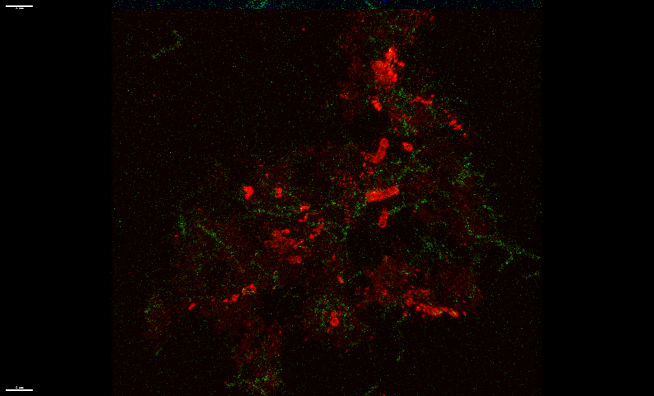 Confocal microscopy image of bacteria from whole saliva cultured in TY media at 37 deg C for 24 hours, with no in vivo or in vitro antimicrobial exposure. Calcophor (red, polysaccharides) and Syto (green, bacteria) dye. Scale at lower left is 3 microns.