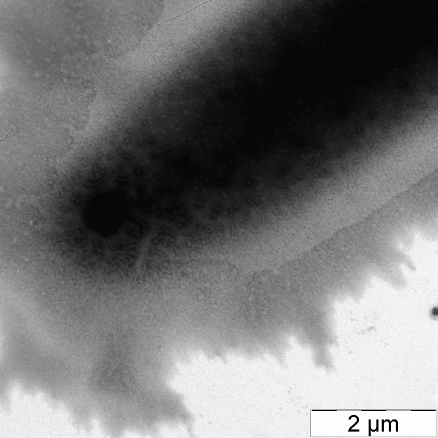 TEM image of cultured bacteria from whole saliva exposed to antimicrobial for 15 hours at 37 deg C in vitro, no in vivo exposure.