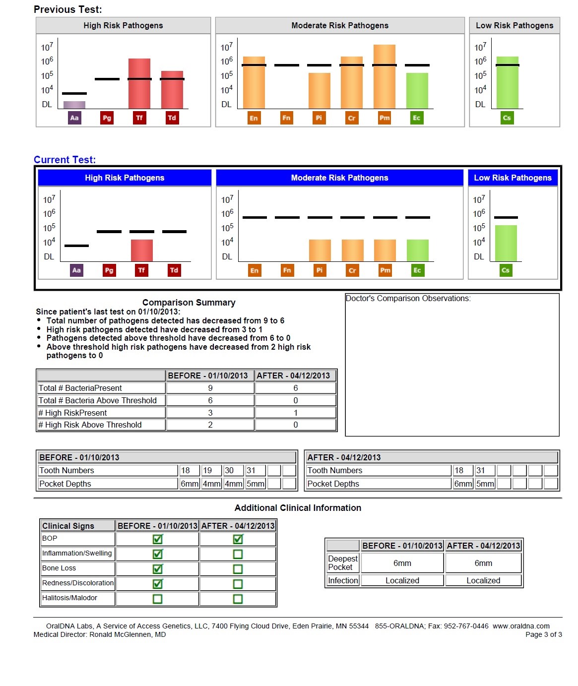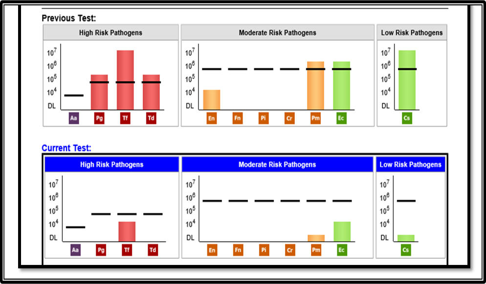 Shown below is a conventional treatment case study and a case study for our antimicrobial. This link to www.mcclatchiedds.com is for my case study source. The study subject had a moderate PD disease risk profile (previous test), but was able to reduce that risk after conventional treatment (current test). A great deal of intervention and treatment was required, however, and the risk of re-infection remains. Below is the test result showing pre-treatment moderate periodontal disease with severe bleeding, inflammation, bone loss, discoloration, and concerning pocket depths (previous test), and the DNA test results after surgical and antibiotic treatment (current test). Each colored column represents a periodontal pathogen. See this sample DNA report or this report, Microbiological goals of periodontal therapy; Periodontology 2000, Vol. 42, 2006, 180-218, for full details of the pathogens and criteria for how they were selected for inclusion in the report.