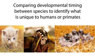 We humans develop for a really long time. Are certain aspects of our development especially late or early relative to other animals? To answer these questions, we are gathering large amounts of data in a number of species to identify what about our developmental timing is unique to humans and our close relatives.